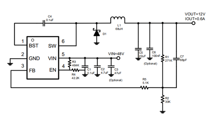 SOT23-6封装,工作频率300KHz,持续输出电流0.6A,峰值限制电流1.3A,完美支持了高电压小电流的应用场景(如BMS、两轮车电控系统)。